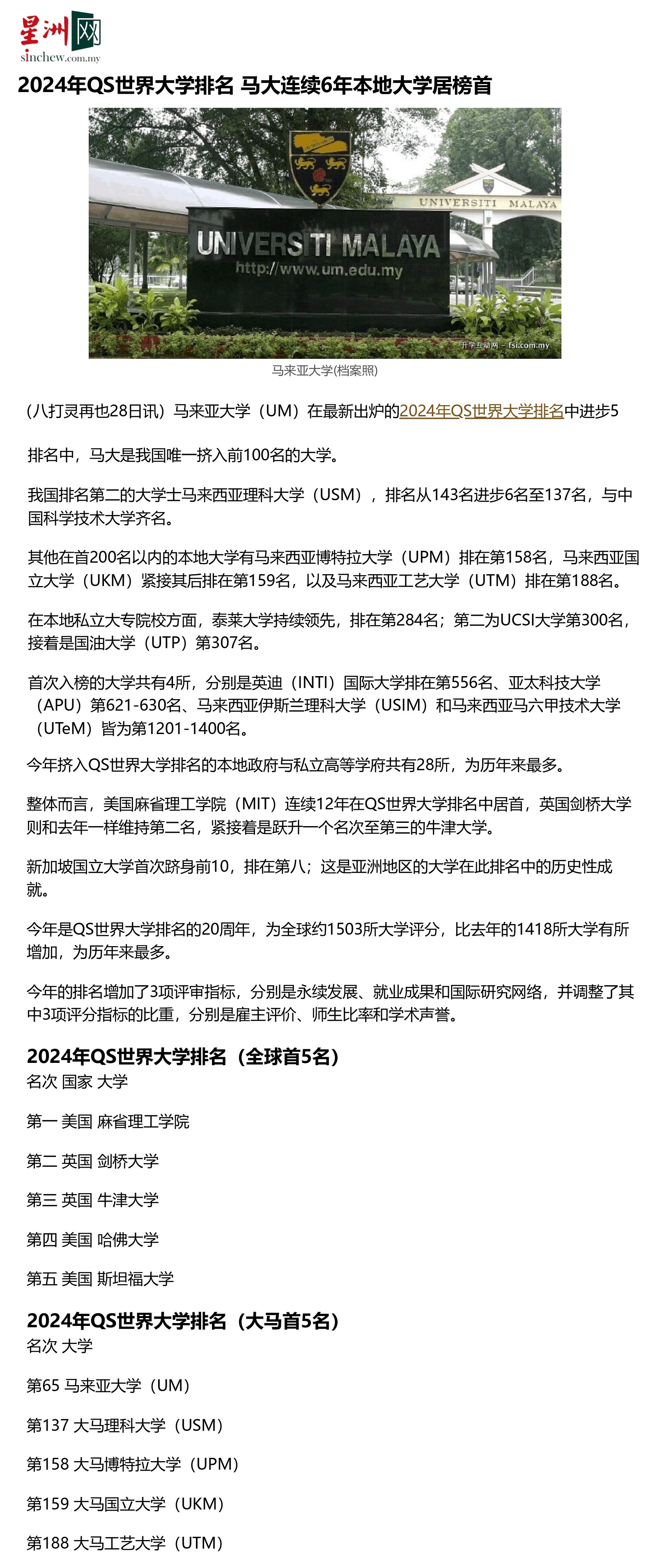2024年QS世界大学排名 马大连续6年本地大学居榜首 - 国内 - 即时国内