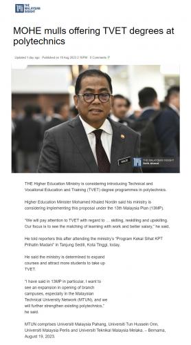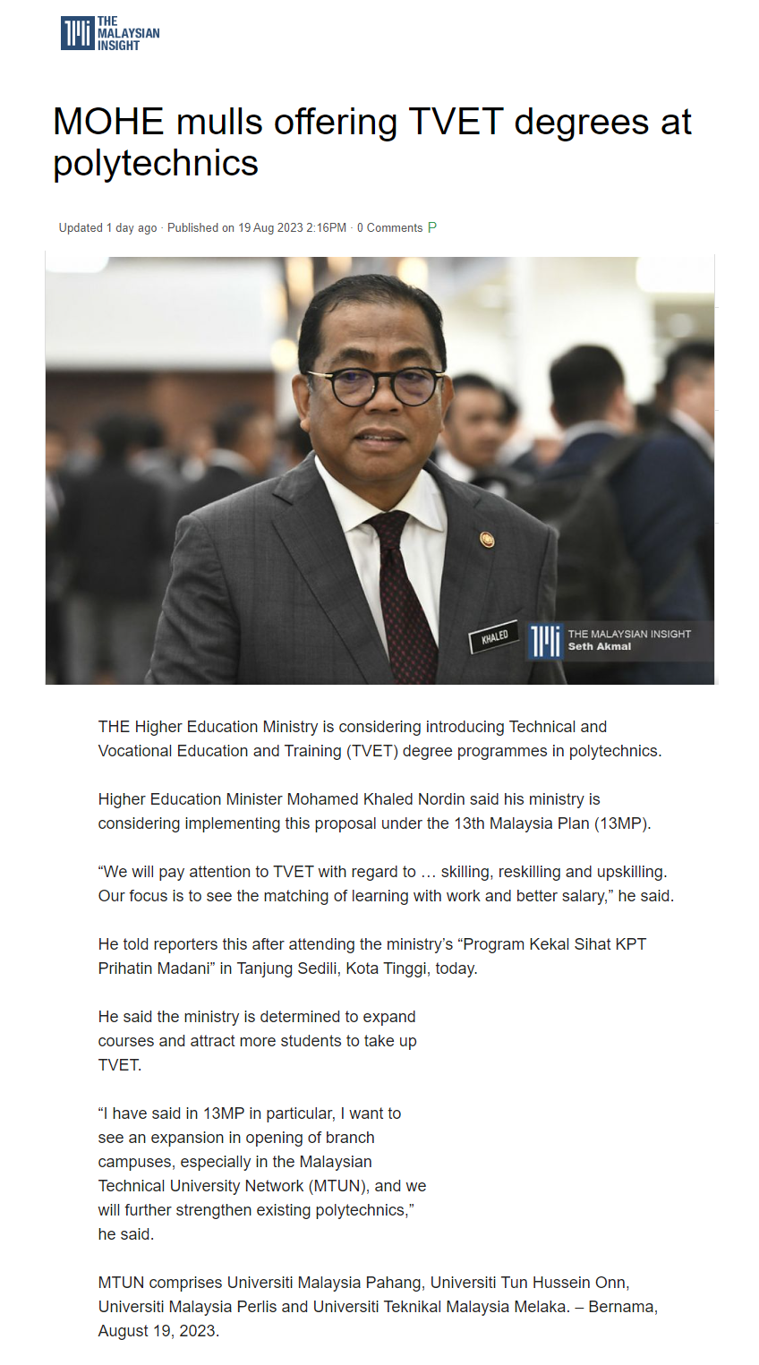 MOHE mulls offering TVET degrees at polytechnics