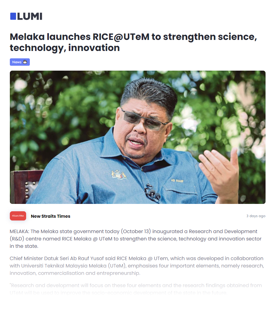 Melaka launches RICE@UTeM to strengthen science, technology, innovation