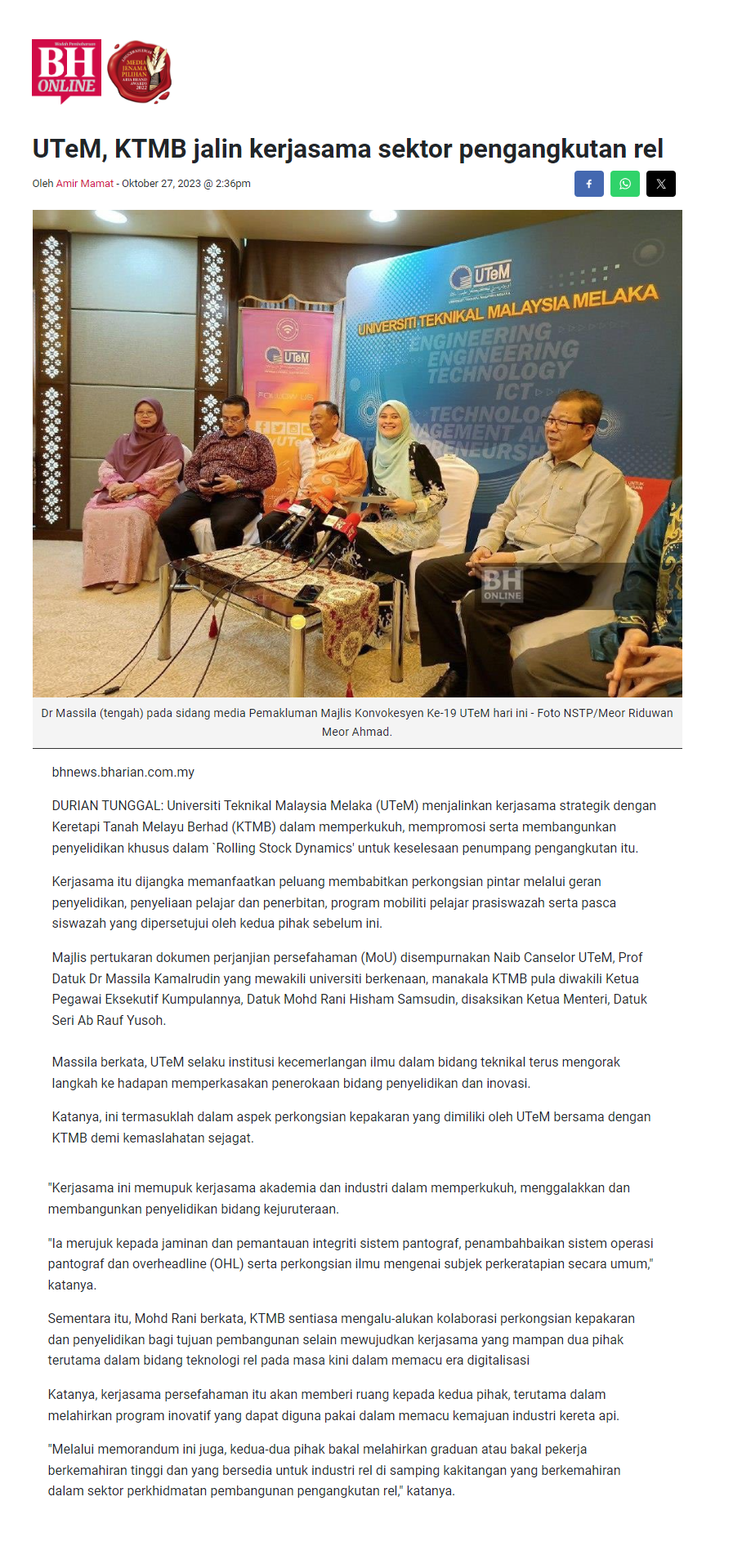 UTeM, KTMB jalin kerjasama sektor pengangkutan rel