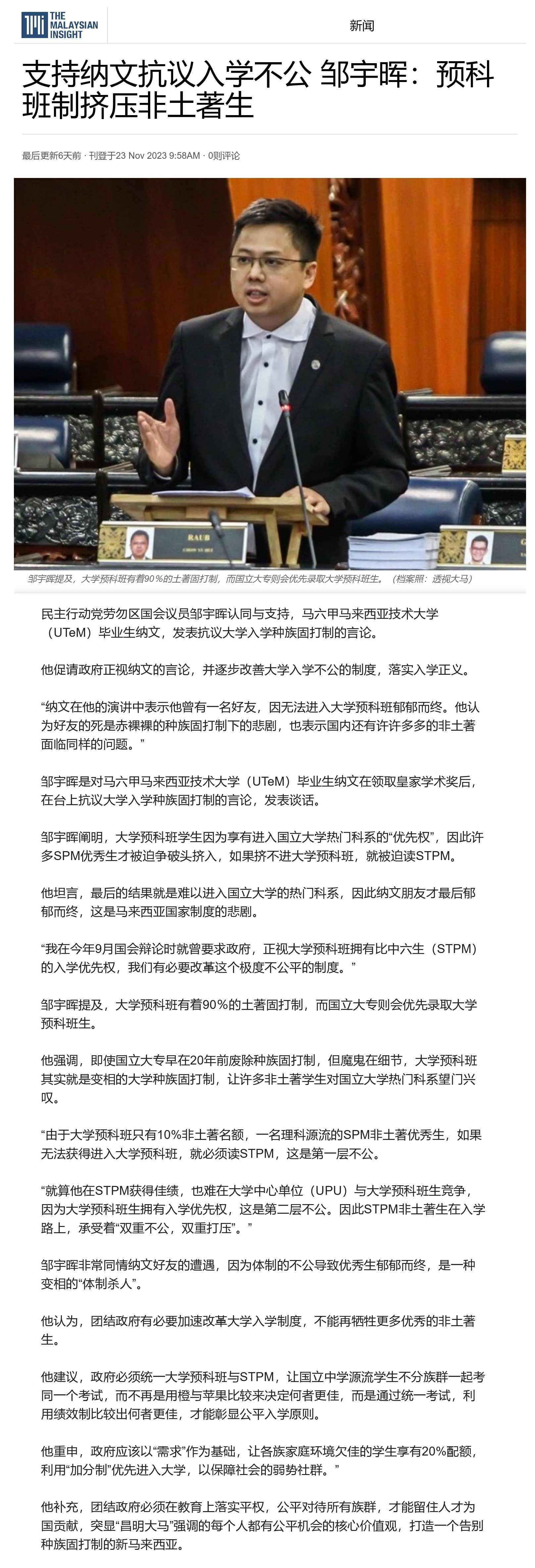 支持纳文抗议入学不公 邹宇晖:预科班制挤压非土著生