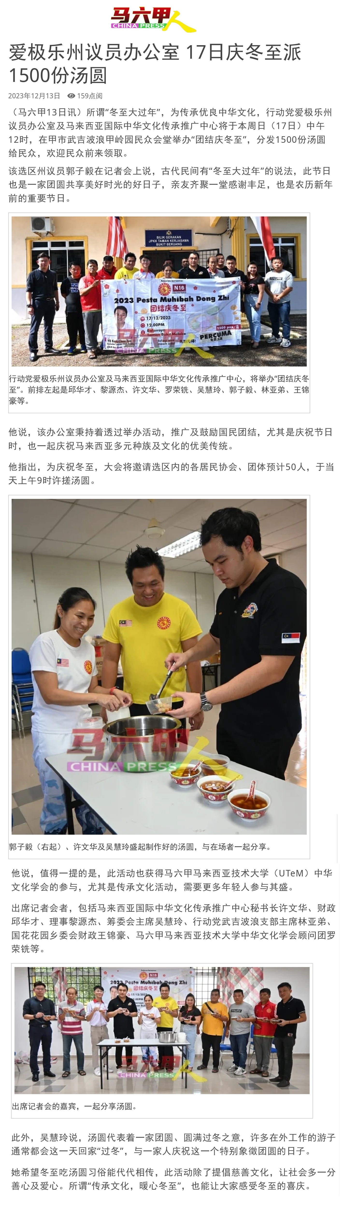 爱极乐州议员办公室 17日庆冬至派1500份汤圆