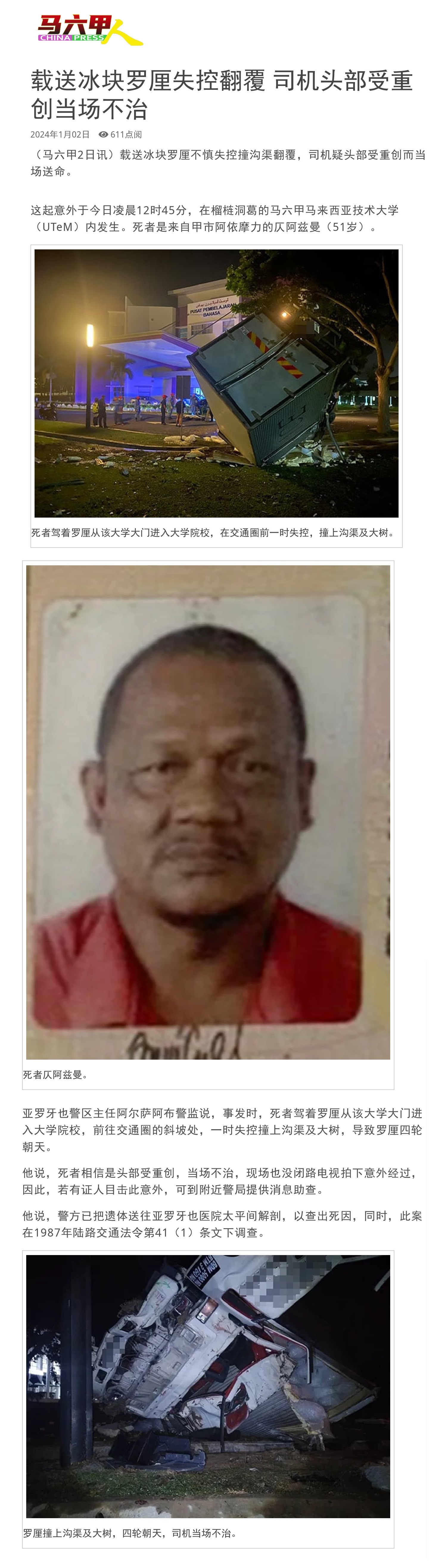 载送冰块罗厘失控翻覆 司机头部受重创当场不治