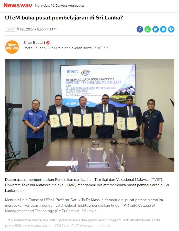 UTeM buka pusat pembelajaran di Sri Lanka?