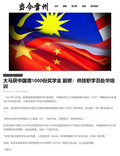 大马获中国增1000份奖学金 副揆:供技职学员赴华培训