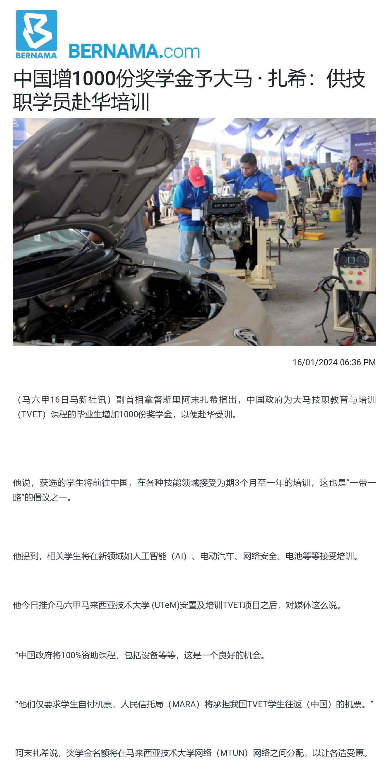 BERNAMA - 中国增1000份奖学金予大马 · 扎希:供技职学员赴华培训