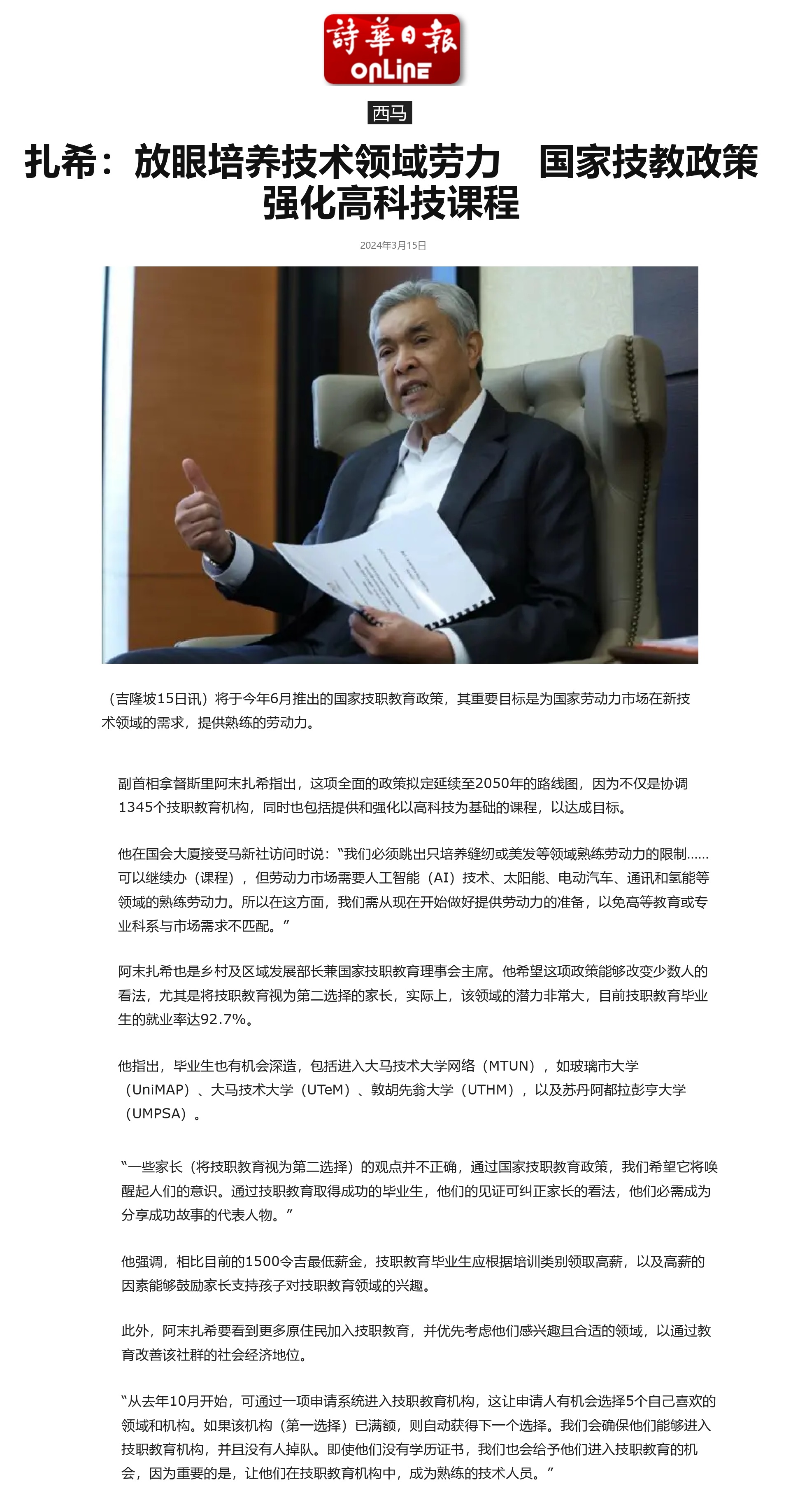 扎希:放眼培养技术领域劳力 国家技教政策强化高科技课程 马来西亚诗华日报新闻网