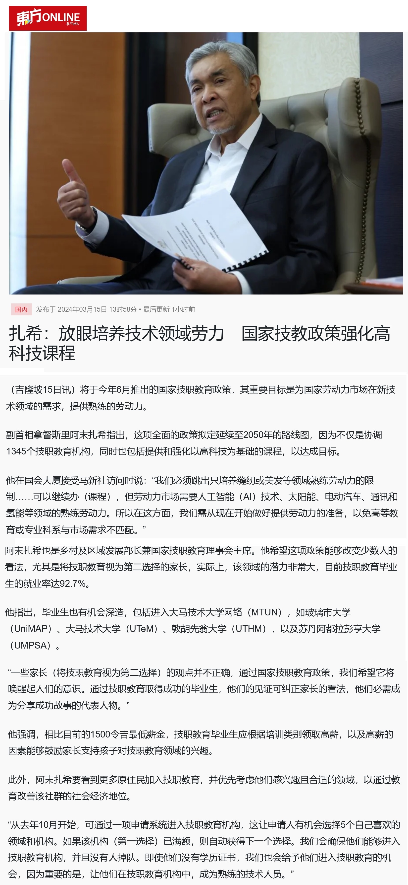 扎希:放眼培养技术领域劳力 国家技教政策强化高科技课程
