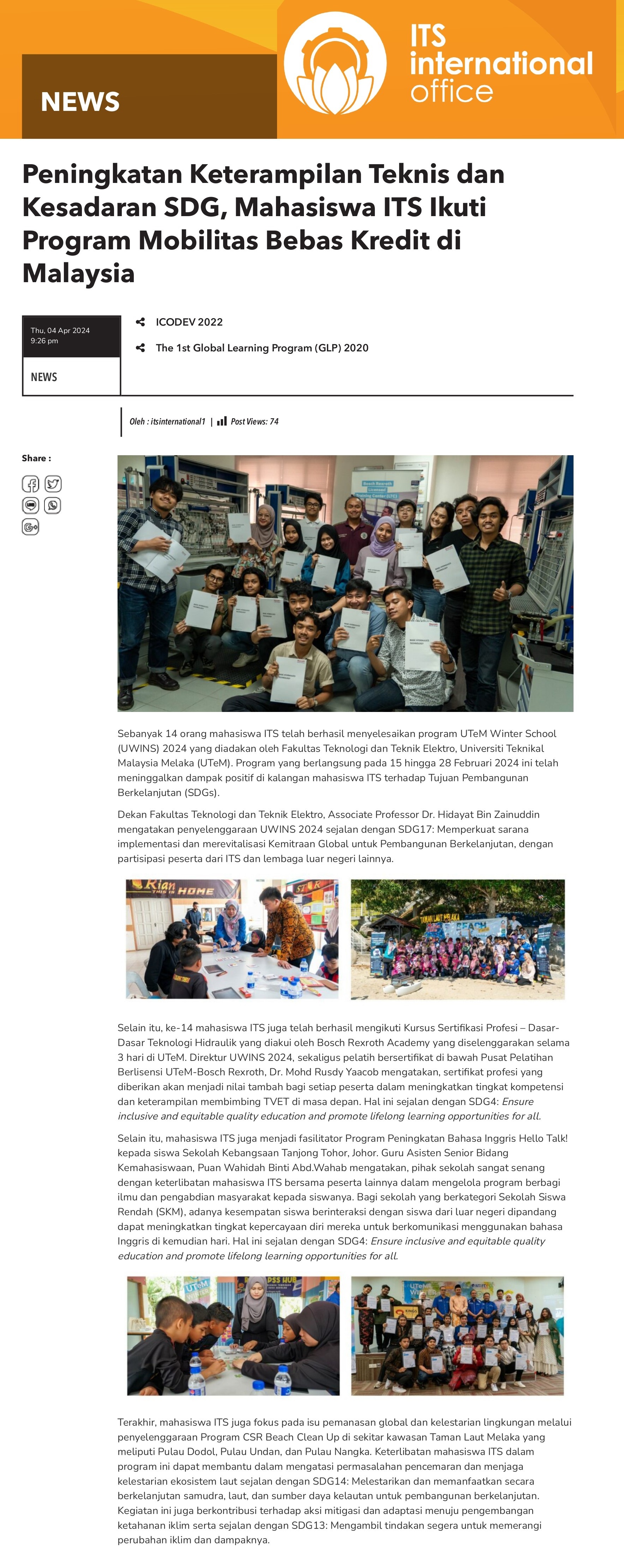 Peningkatan Keterampilan Teknis dan Kesadaran SDG, Mahasiswa ITS Ikuti Program Mobilitas Bebas Kredit di Malaysia