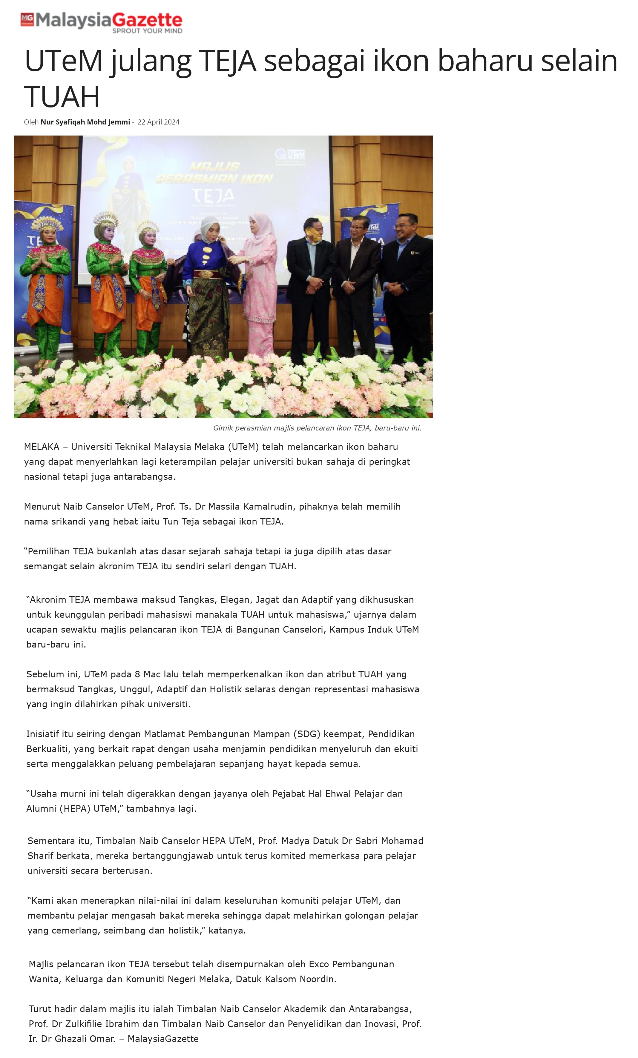 UTeM julang TEJA sebagai ikon baharu selain TUAH