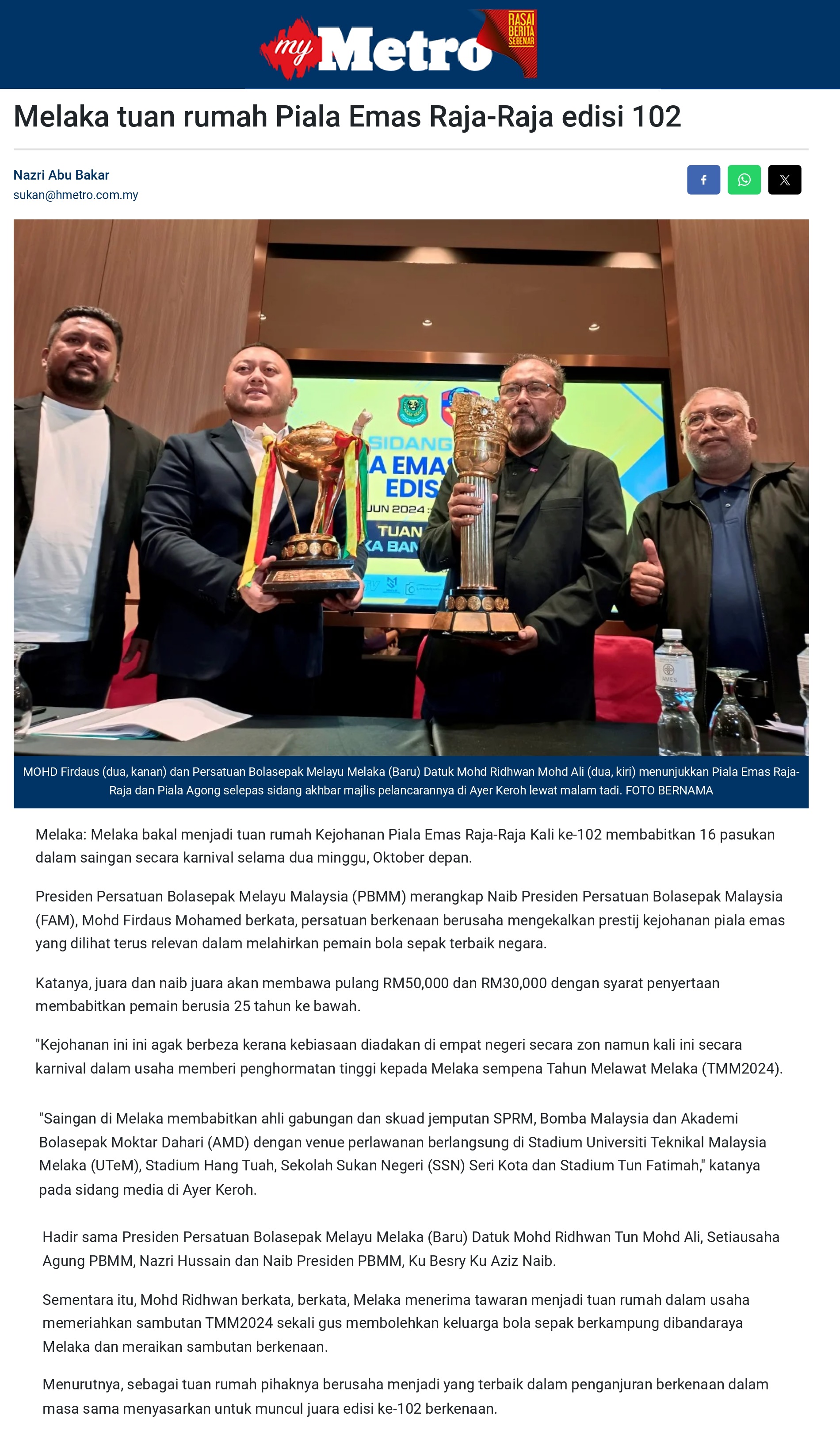 Melaka tuan rumah Piala Emas Raja-Raja edisi 102