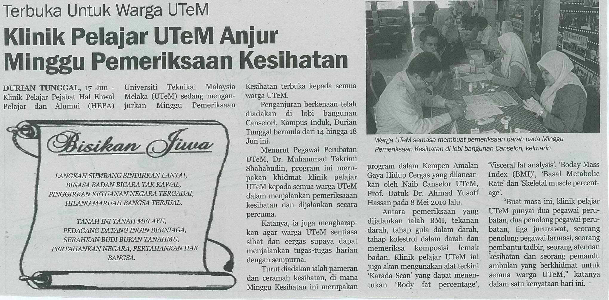 Klinik Pelajar UTeM Anjur Minggu Pemeriksaan Kesihatan