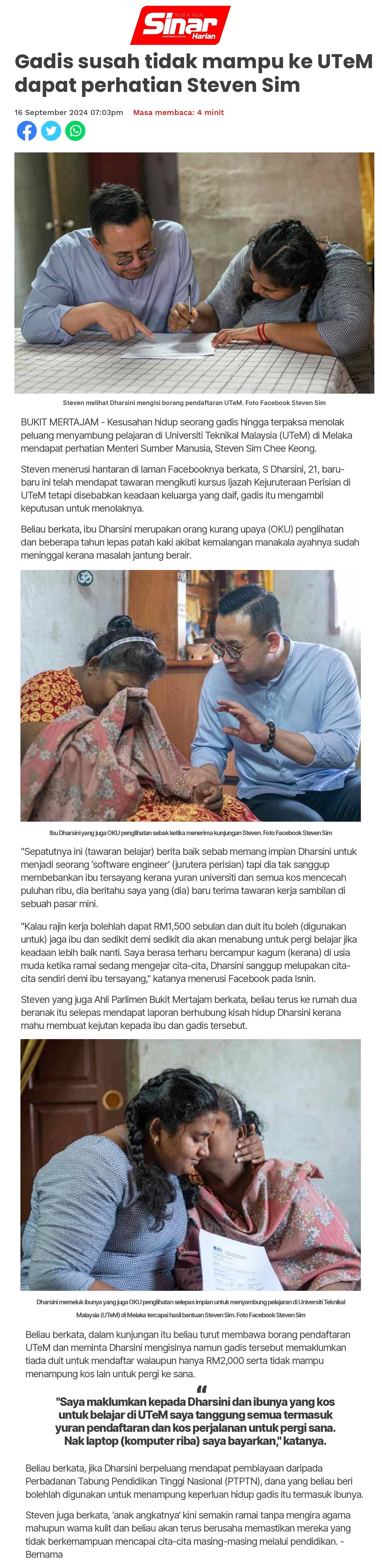 Gadis susah tidak mampu ke UTeM dapat perhatian Steven Sim