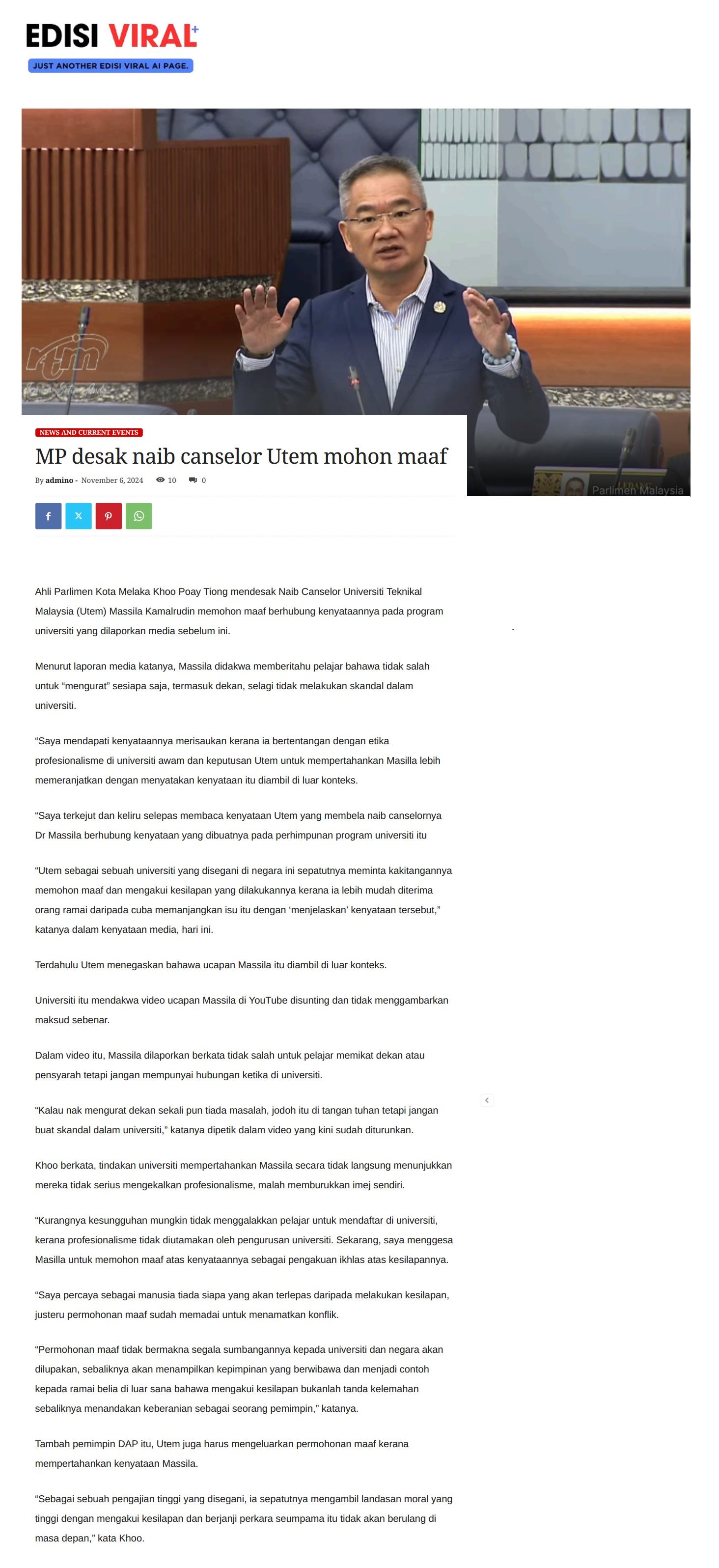 MP desak naib canselor Utem mohon maaf