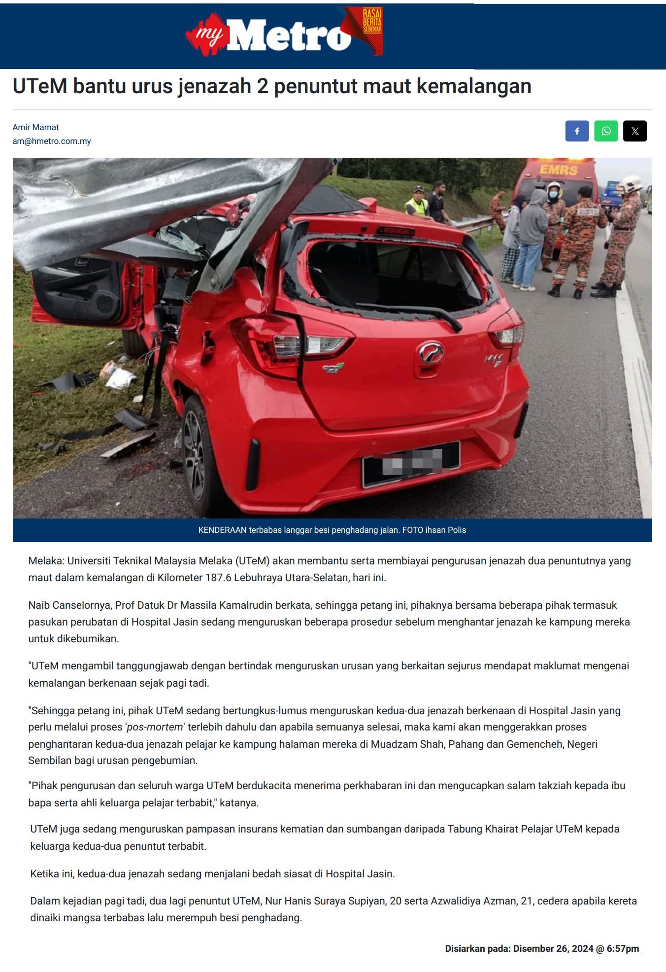 734 UTeM bantu urus jenazah 2 penuntut maut kemalangan