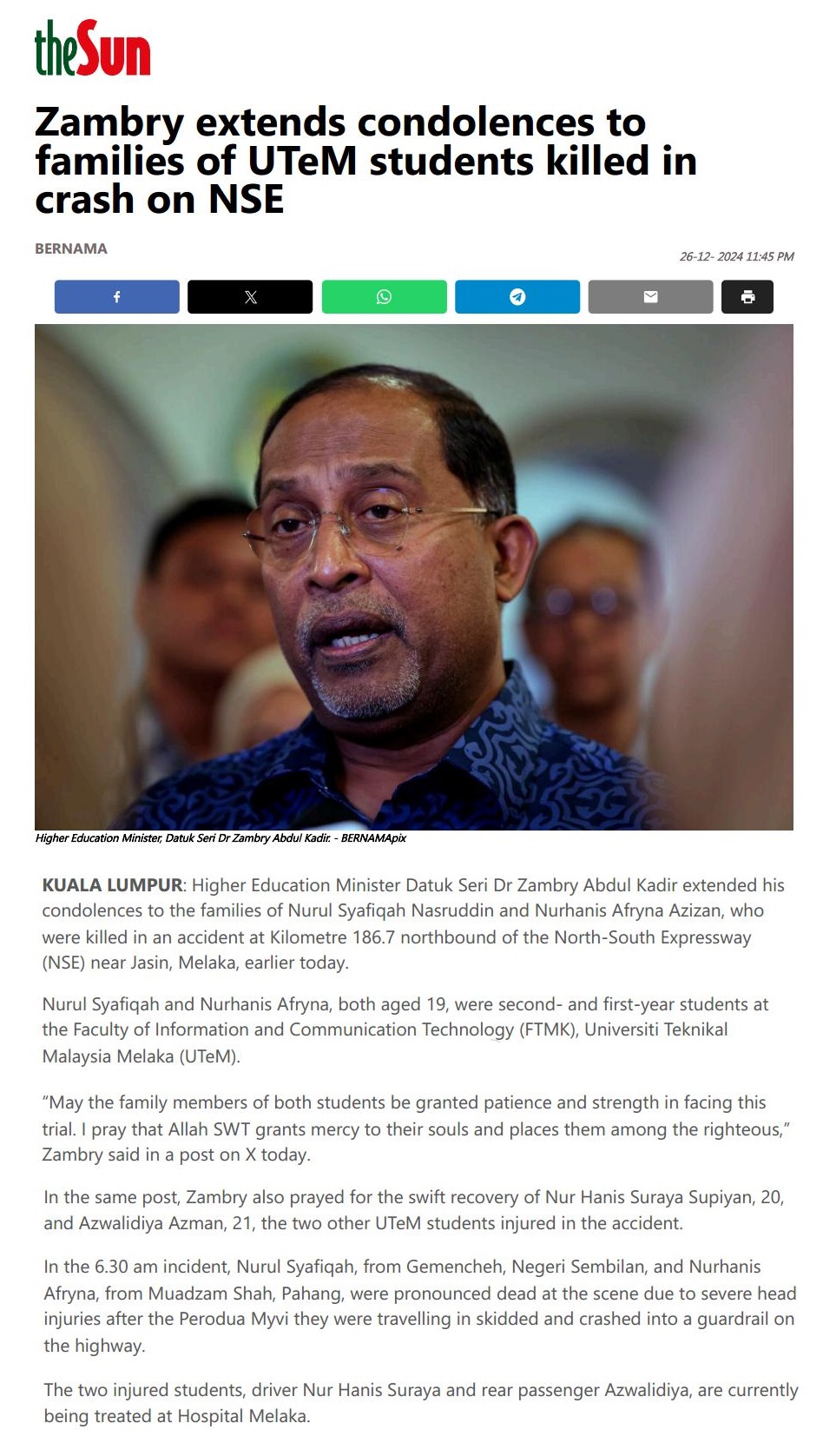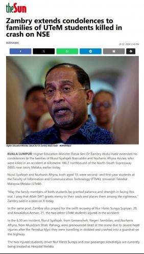 735 Zambry extends condolences to families of UTeM students killed in crash on NSE