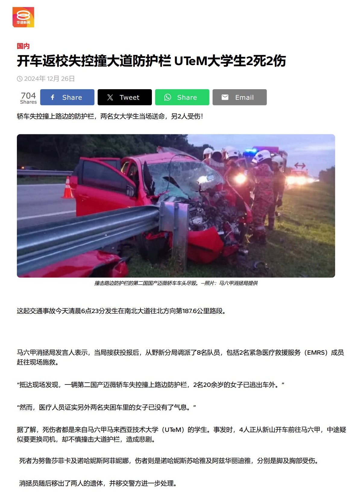743 开车返校失控撞大道防护栏 UTeM大学生2死2伤