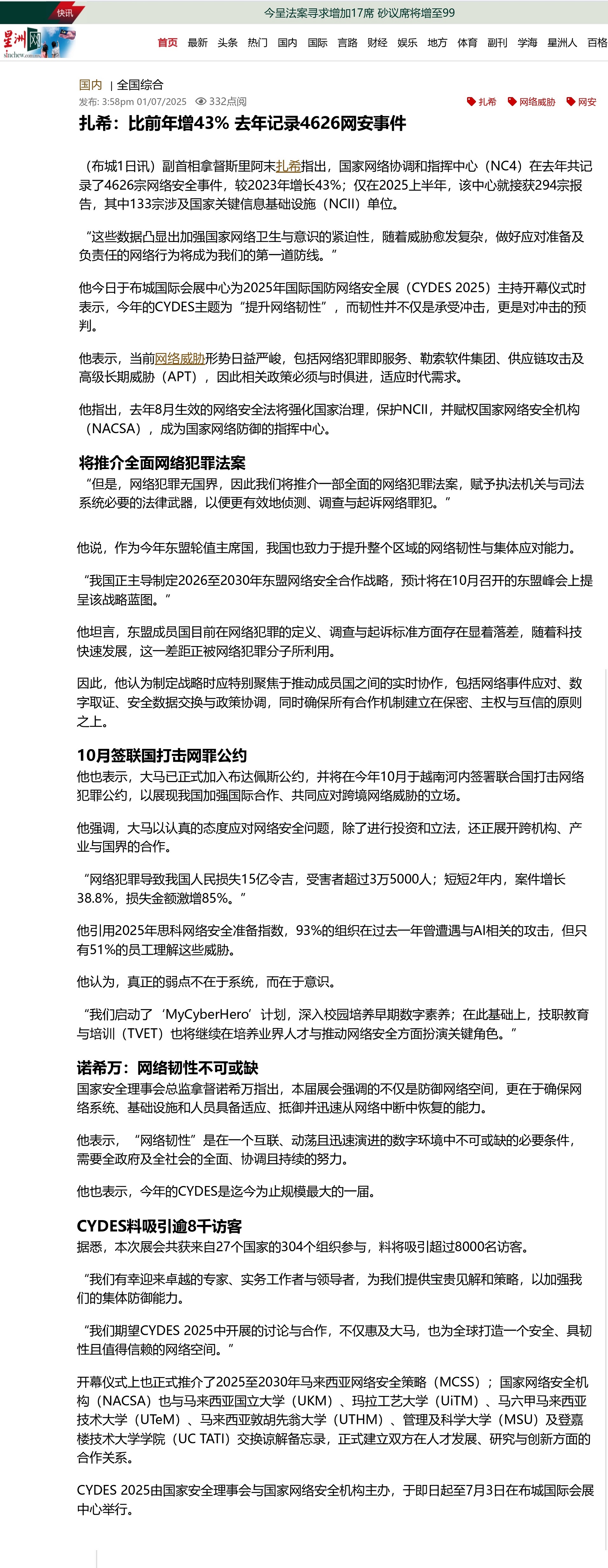 273 扎希:比前年增43 去年记录4626网安事件 - 国内 - 全国综合