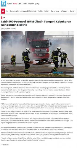 526 BERNAMA - Lebih 100 Pegawai JBPM Dilatih Tangani Kebakaran Kenderaan Elektrik