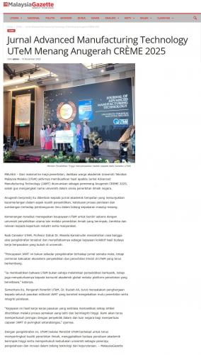 601 Jurnal Advanced Manufacturing Technology UTeM Menang Anugerah CRÈME 2025
