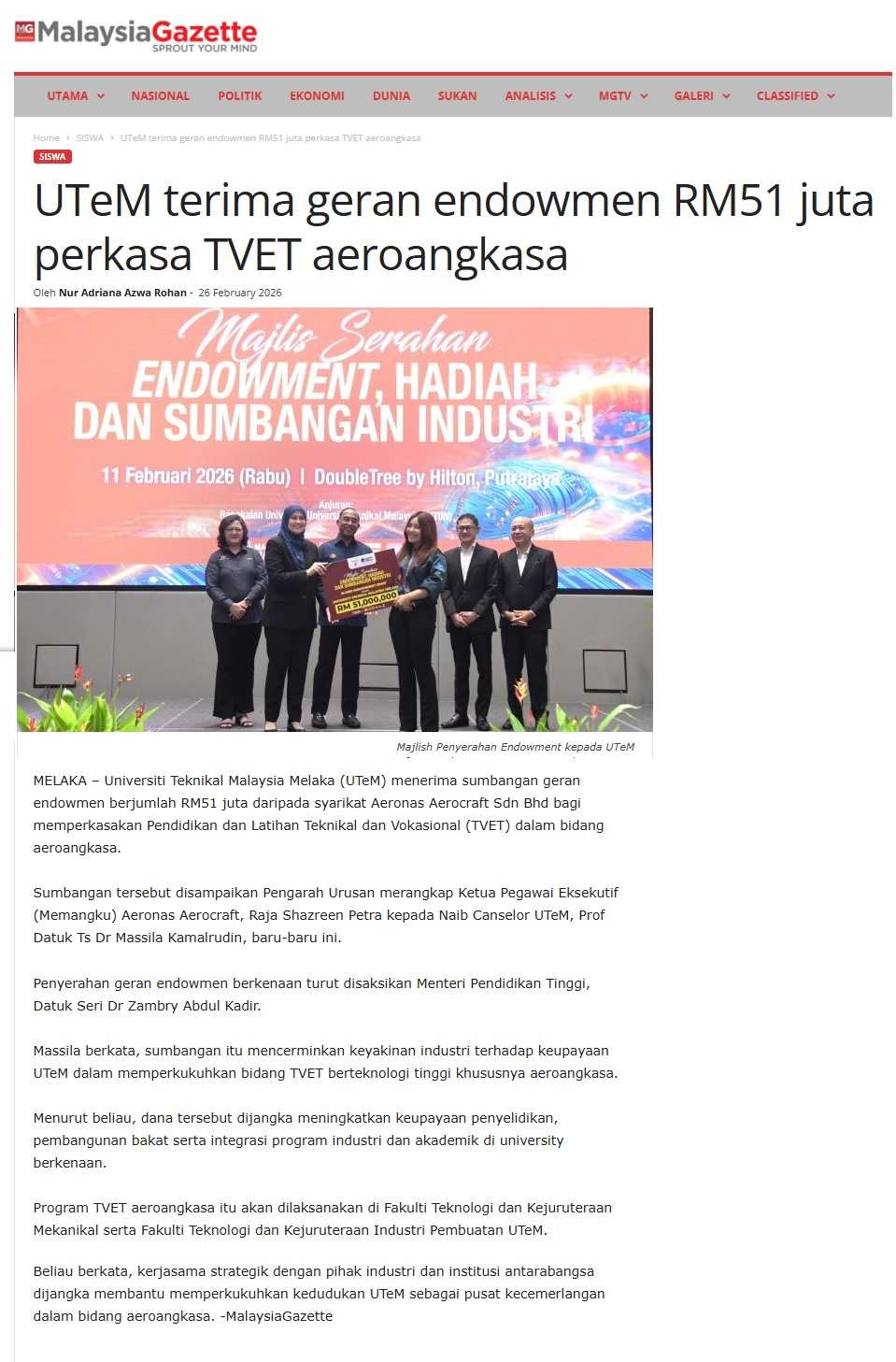 124 UTeM terima geran endowmen RM51 juta perkasa TVET aeroangkasa