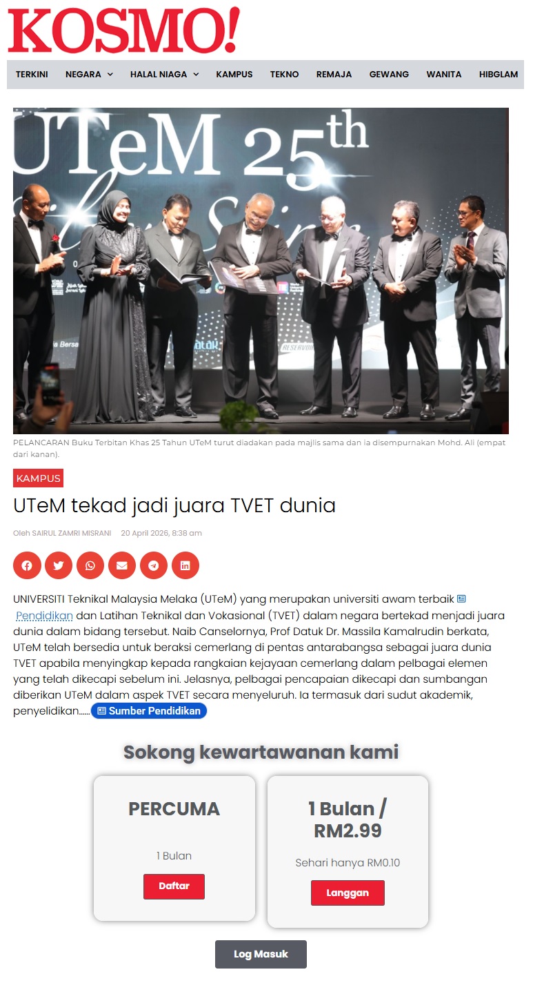 188 UTeM tekad jadi juara TVET dunia - Kosmo Digital