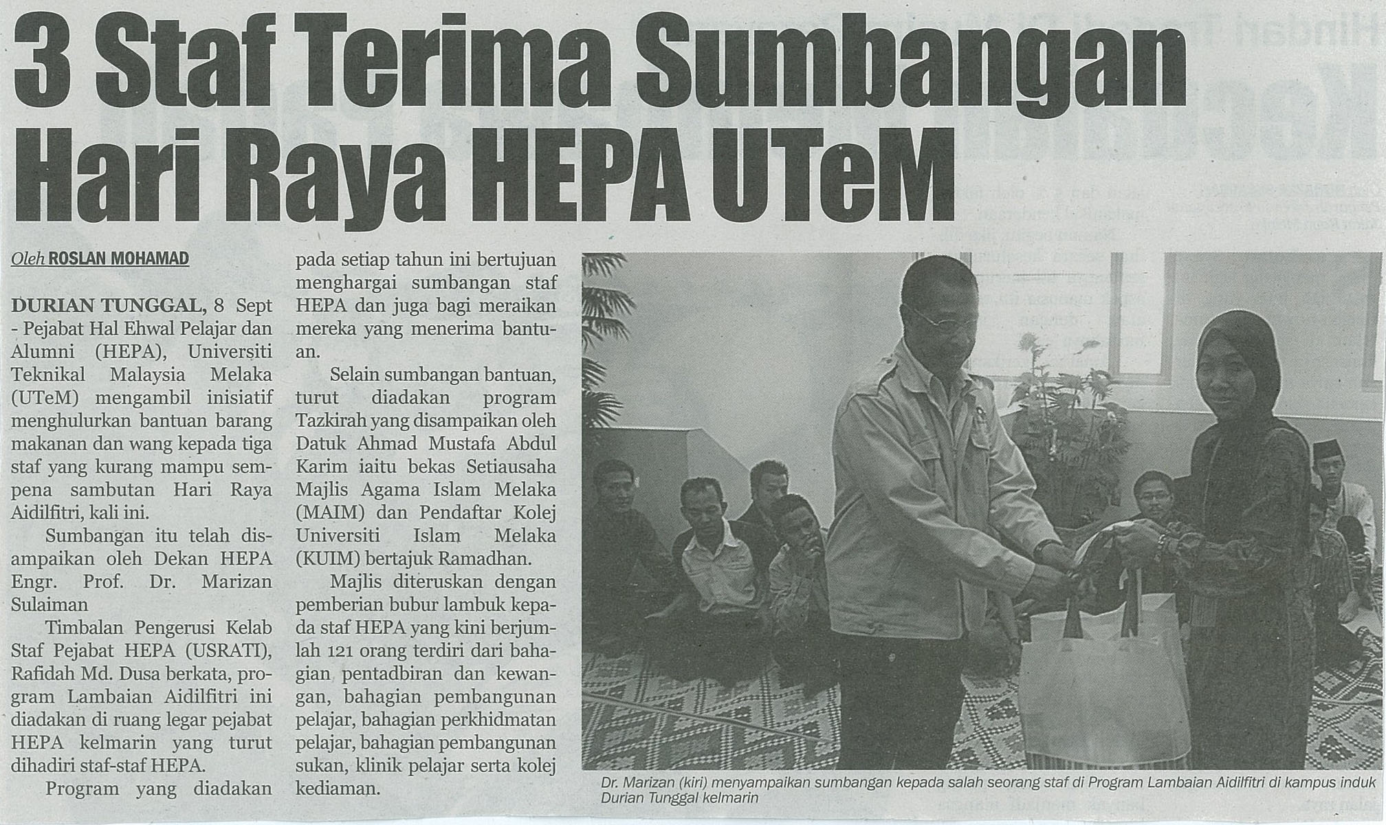 3 Staf Terima Sumbangan Hari Raya HEPA UTeM