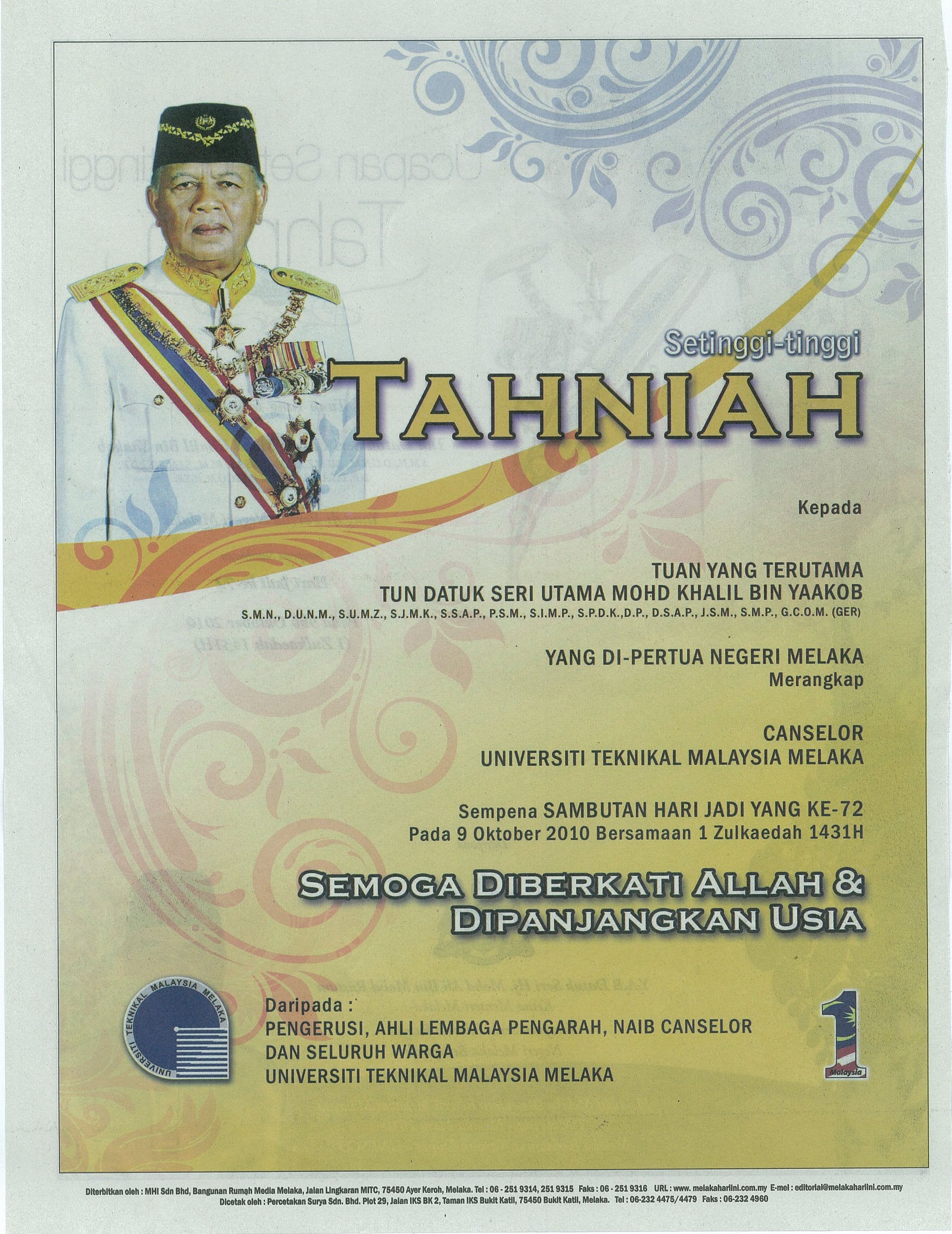 Iklan Tahniah Sempena Sambutan Hari Jadi Yang Ke-72 Yang Di-Pertua Negeri Melaka