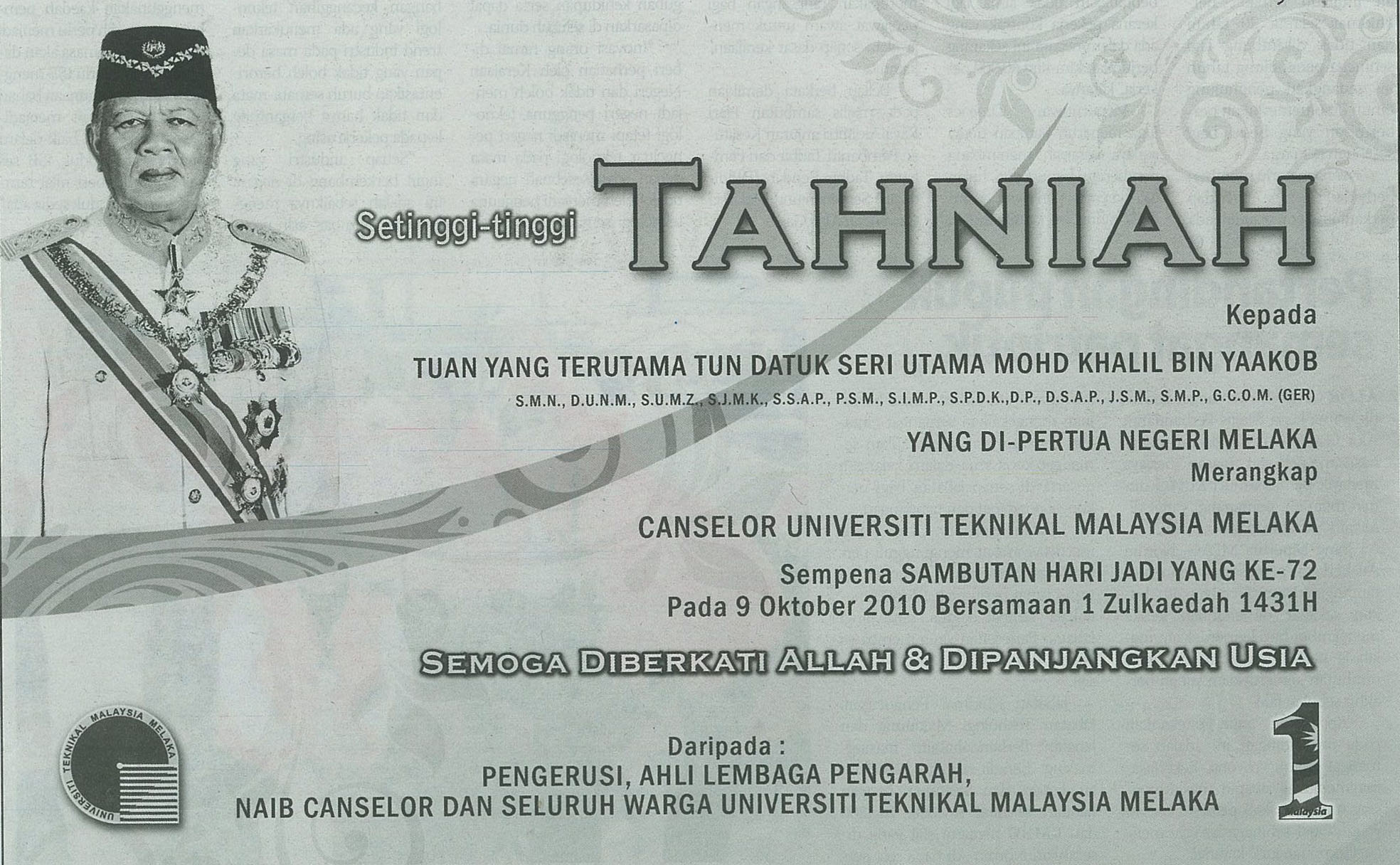 Iklan ucapan Tahniah Sempena Sambutan hari Jadi yang Ke-72 Yang Di-Pertua Negeri Melaka