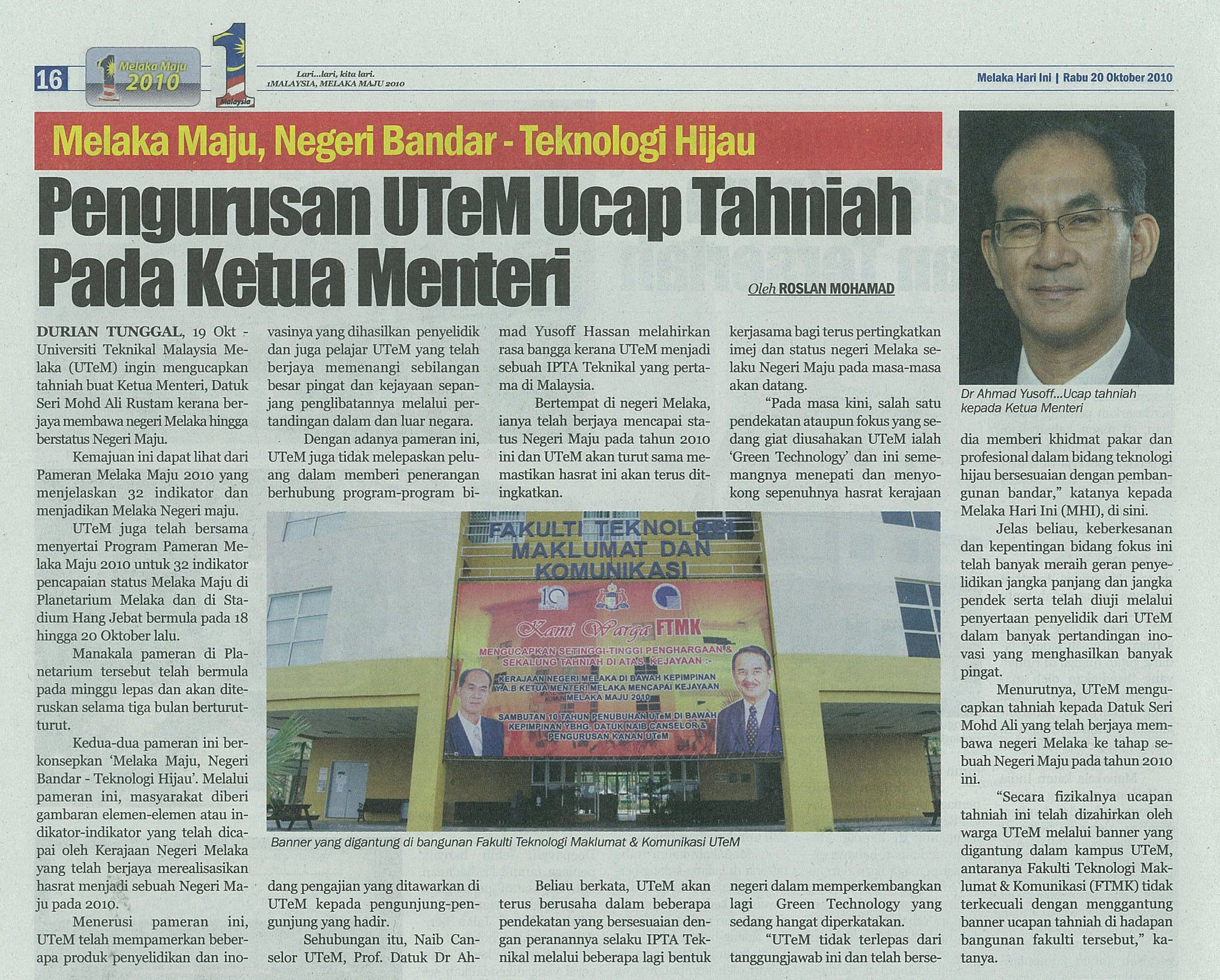 Melaka Maju, Negeri Bandar-Teknologi Hijau Pengurusan UTeM Ucap Tahniah Pada Ketua Menteri