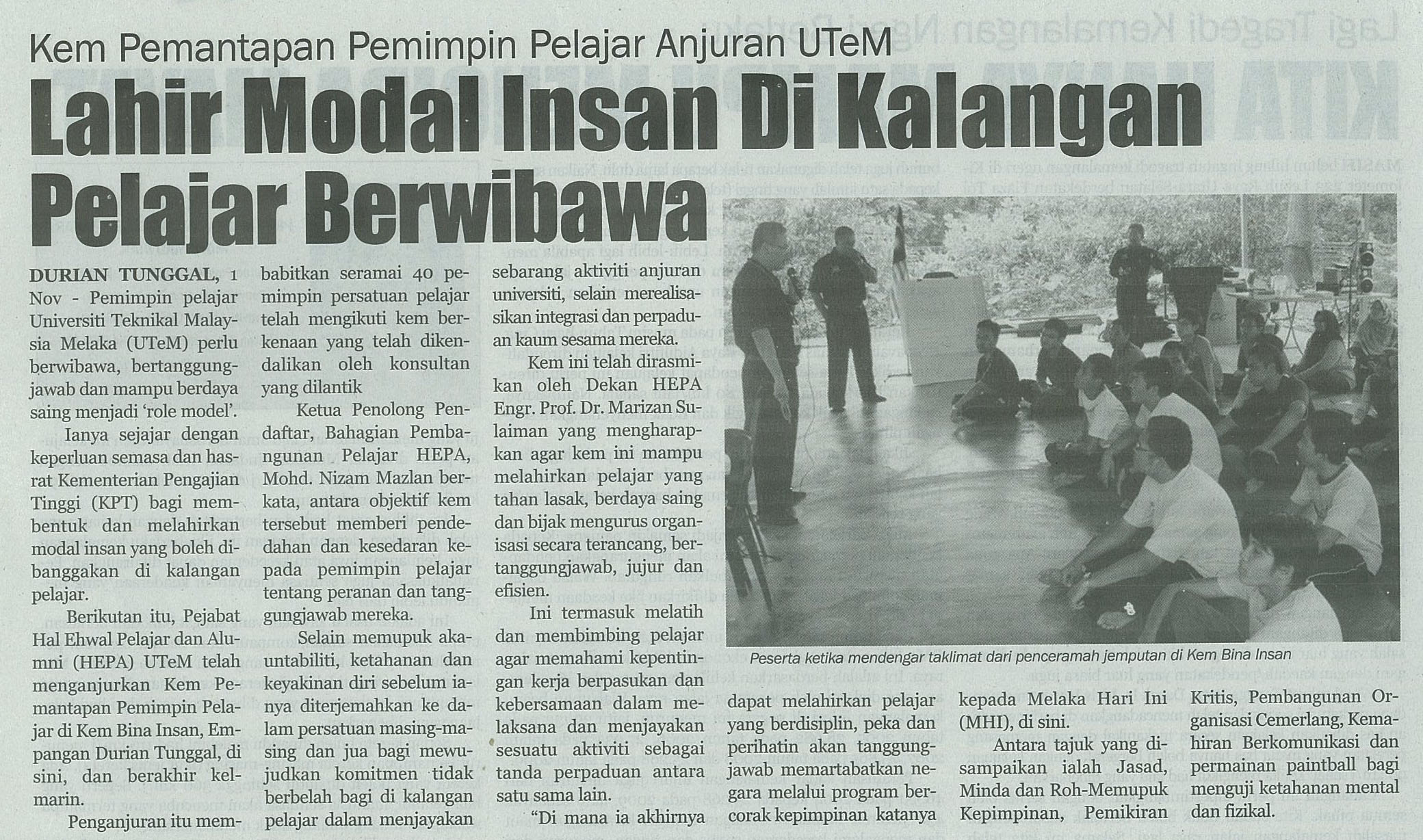 Kem Pemantapan Pemimpin Pelajar Anjuran UTeM lahir Modal Insan Di Kalangan pelajar Berwibawa