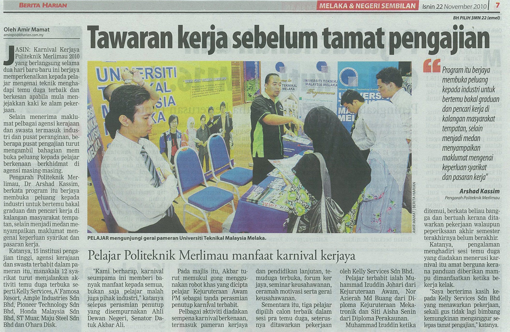 Tawaran kerja sebelum tamat pengajian Pelajar Politeknik Merlimau manfaat karnival kerjaya