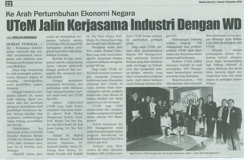 Ke Arah Pertumbuhan Ekonomi Negara UTeM Jalin Kerjasama Industri Dengan WD