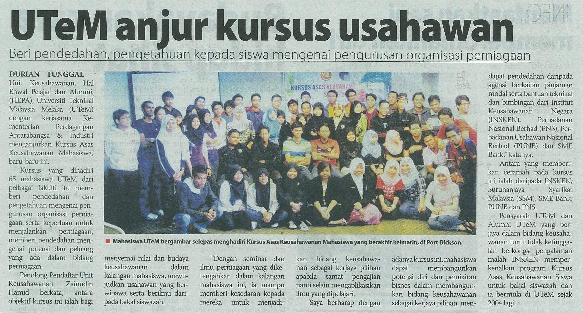 UTeM anjur kursus usahawan Beri pendedehan, pengetahuan kepada siswa mengenai pengurusan organisasi perniagaan