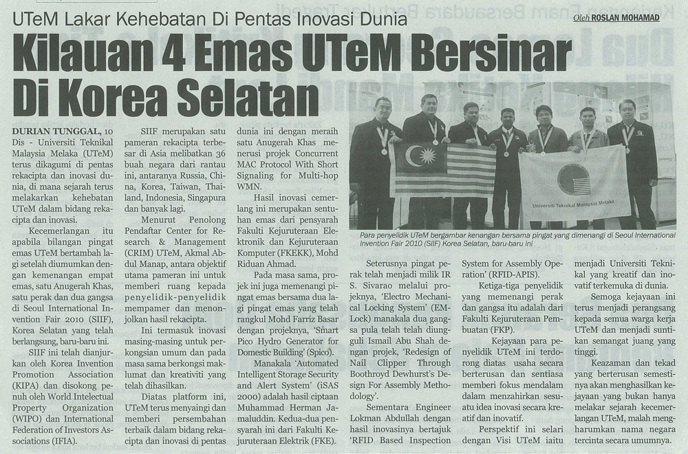 UTeM Lakar Kehebatan Di Pentas Inovasi Dunia. Kilauan 4 Emas UTeM Bersinar Di Korea Selatan