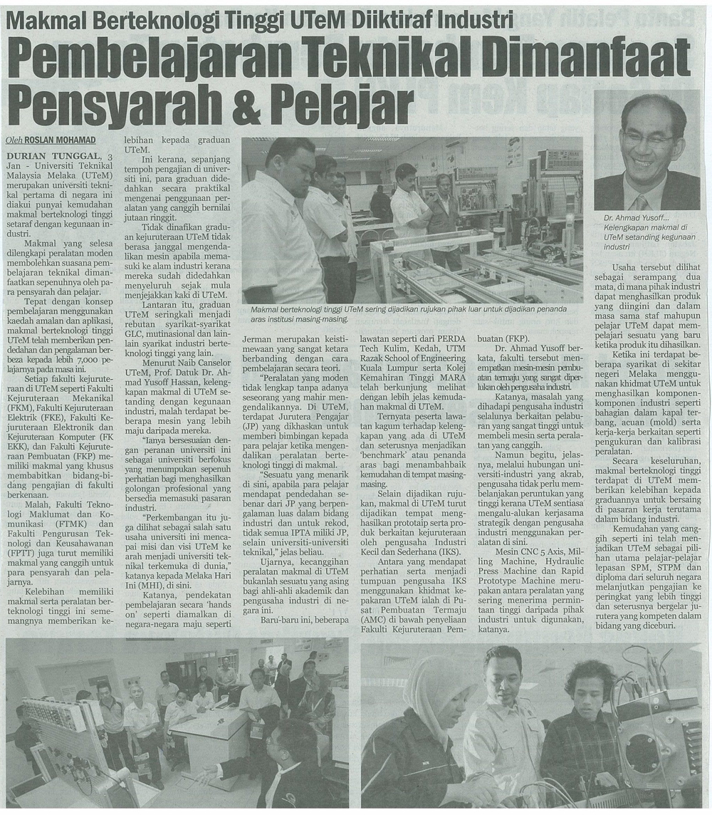 Makmal Berteknologi Tinggi UTeM Diiktiraf Industri Pembelajaran Teknikal Dimanfaat Pensyarah dan Pelajar