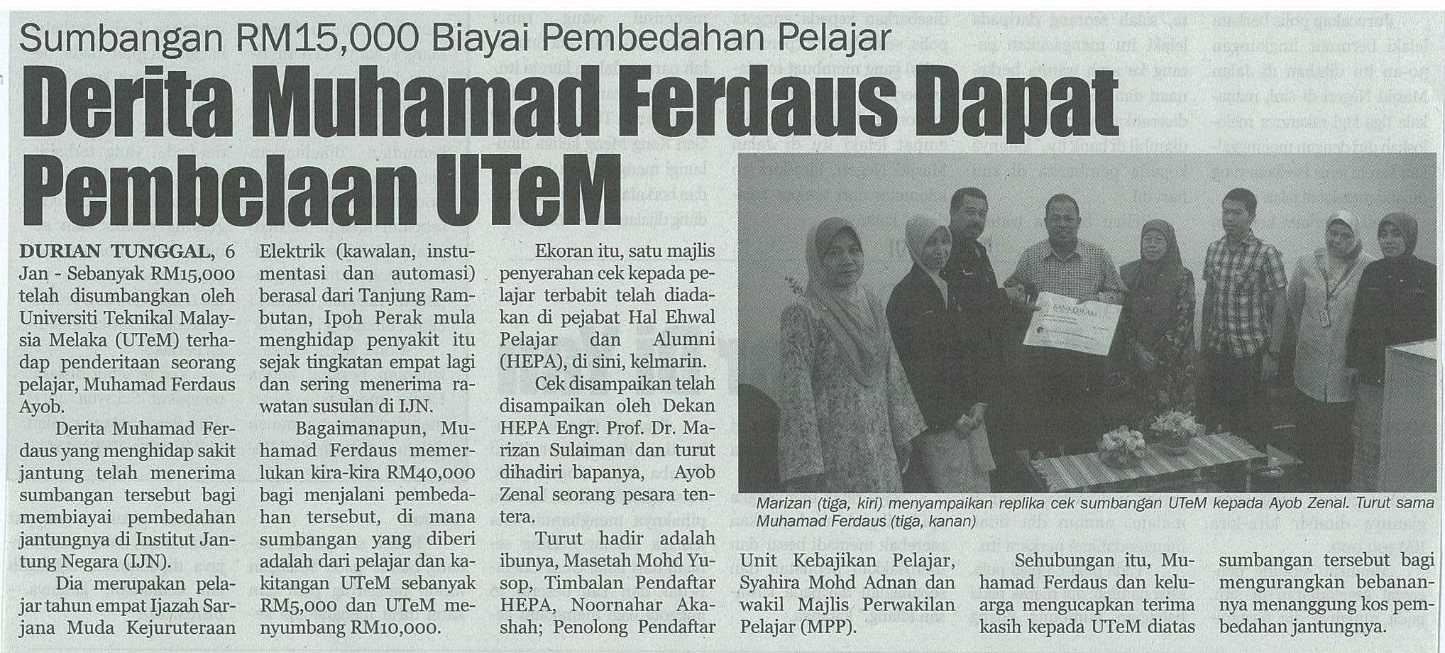 Sumbangan RM15,000 Biayai Pembedahan Pelajar Derita Muhamad Ferdaus Dapat Pembelaan UTeM