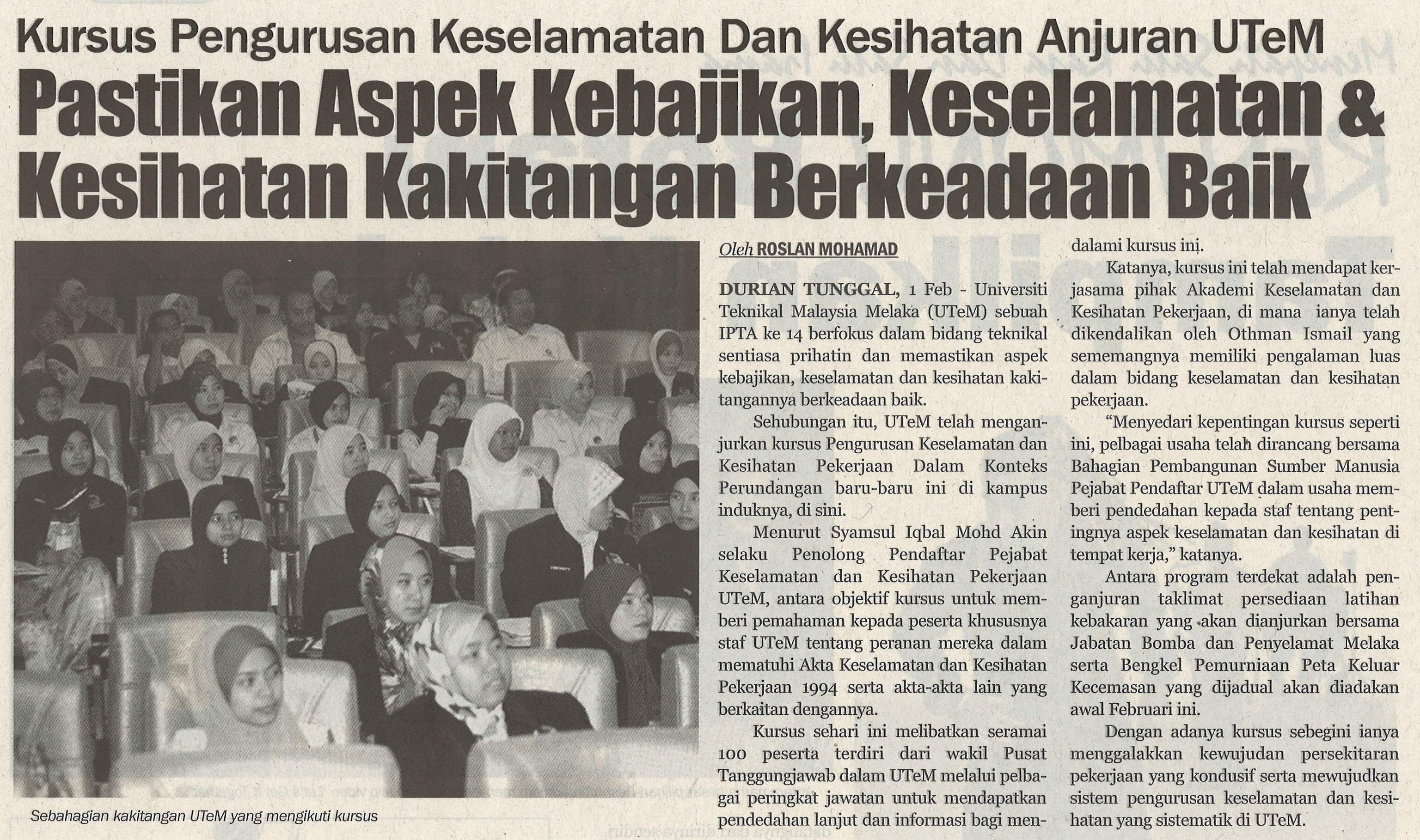 Kursus Pengurusan Keselamatan Dan Kesihatan Anjuran UTeM Pastikan Aspek Kebajikan, Keselamatan & Kesihatan Kakitangan Berkeadaan Baik