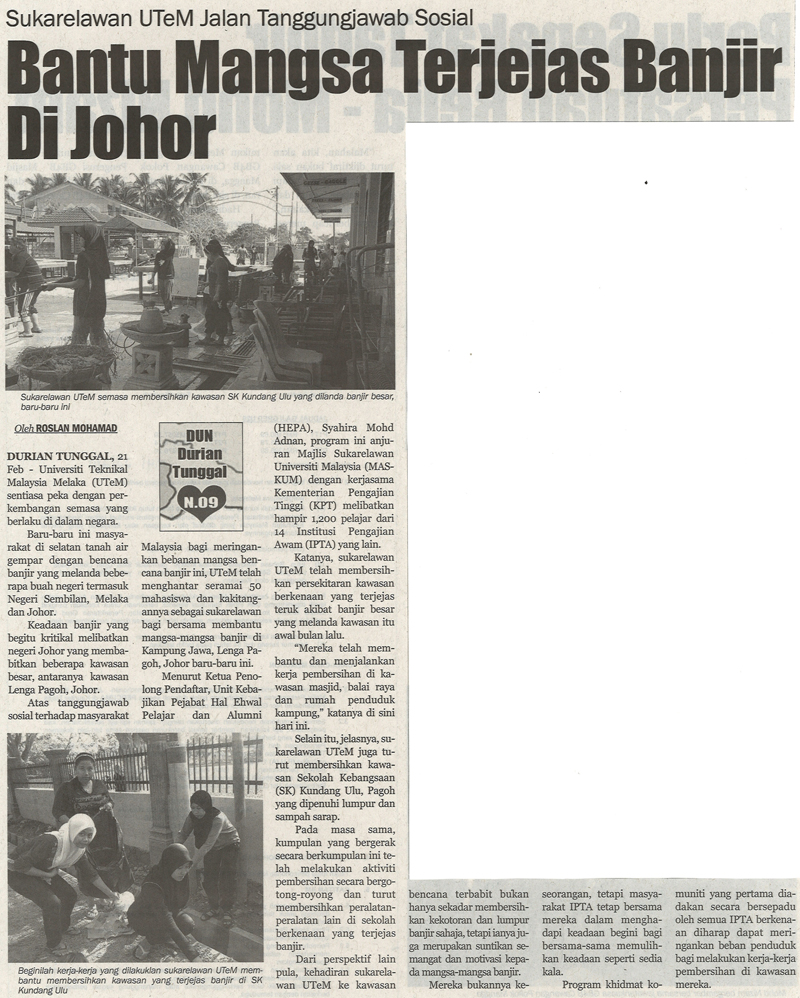 Sukarelawan UTeM Jalan Tanggungjawab Sosial Bantu Mangsa Terjejas Banjir di Johor