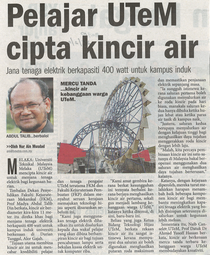 Pelajar UTeM cipta kincir air Jana tenaga elektrik berkapasiti 400 watt untuk kampus induk