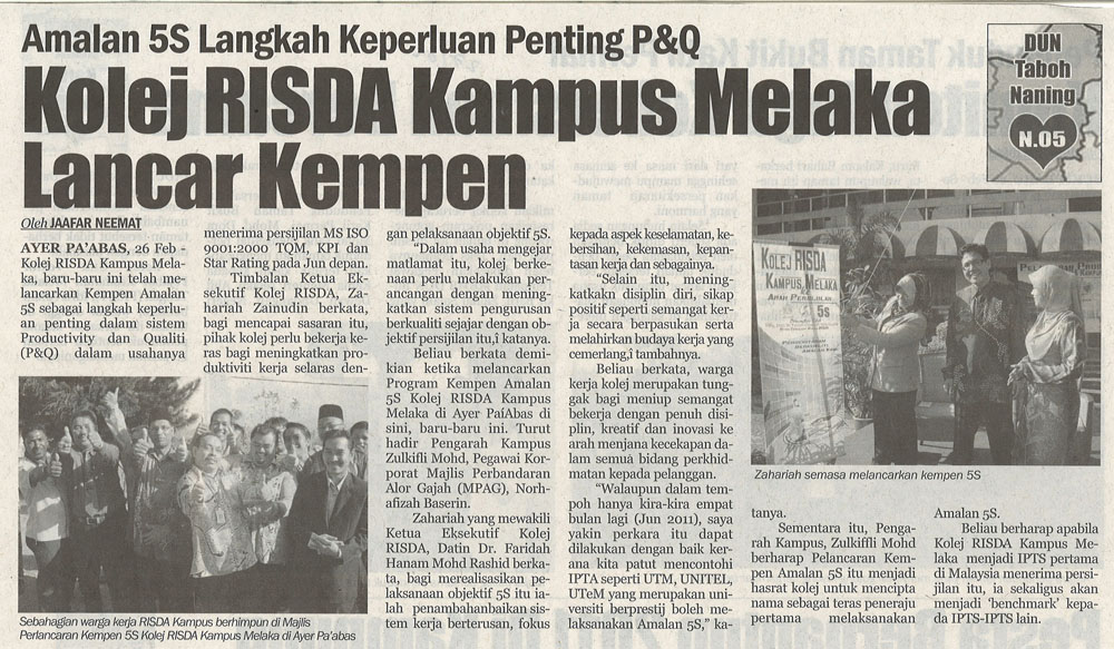 Amalan 5S Langkah Keperluan Penting P&Q Kolej RISDA Kampus Melaka Lancar Kempen