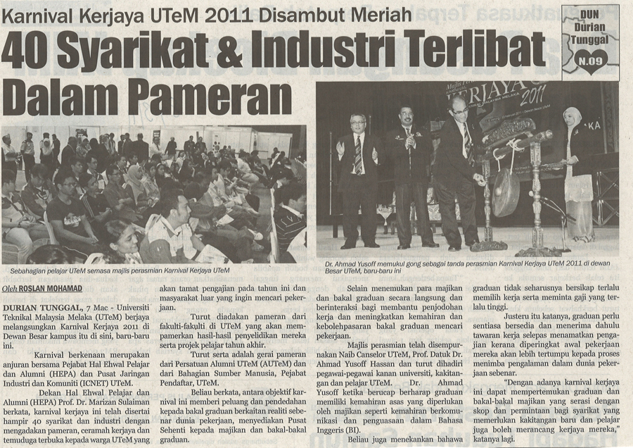 Karnival Kerjaya UTeM 2011 Disambut Meriah 40 Syarikat & Industri Terlibat Dalam Pameran