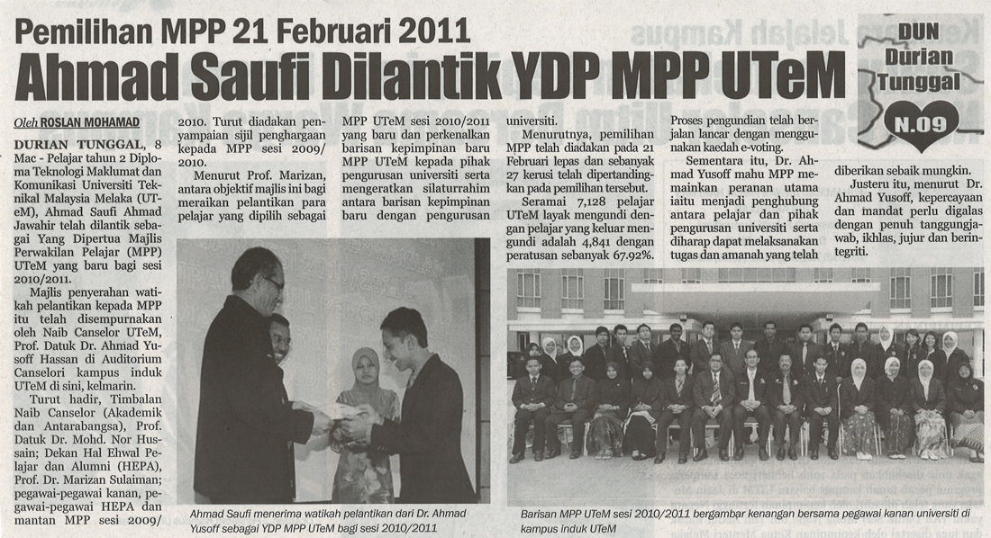 Pemilihan MPP 21 februari 2011 Ahmad Saufi dilantik YDP MPP UTeM