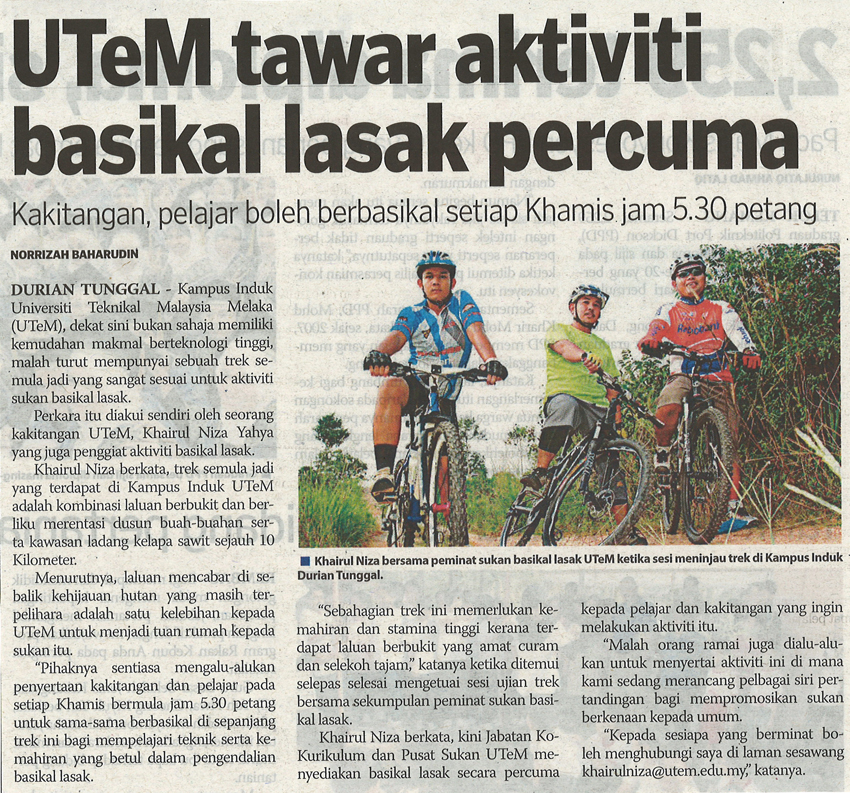UTeM tawar aktiviti basikal lasak percuma Kakitangan, pelajar boleh berbasikal setiap Khamis jam 5.30 petang