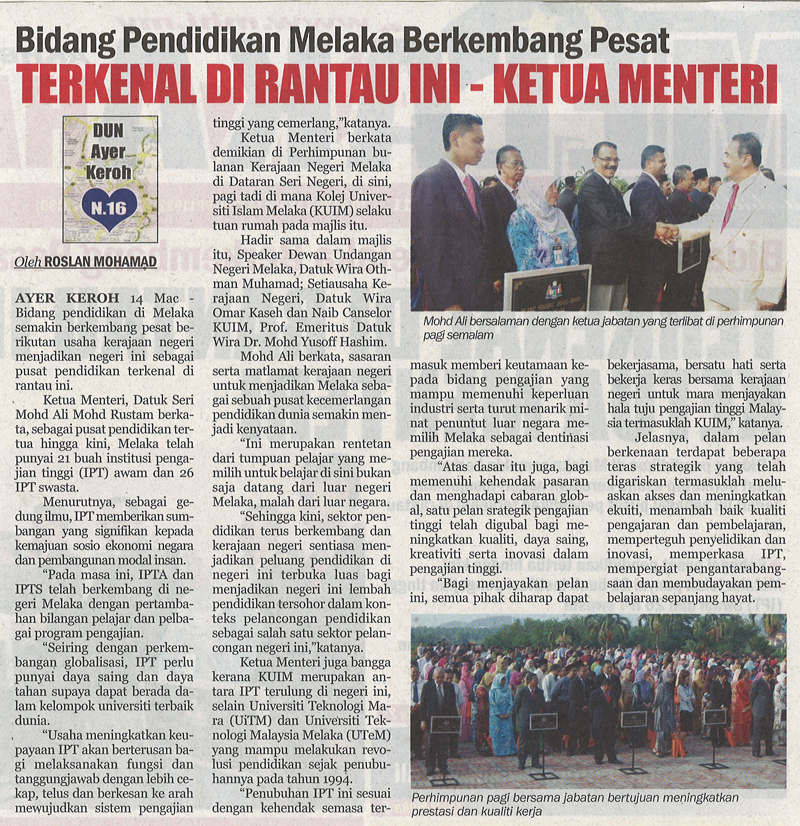 Bidang Pendidikan Melaka Berkembang Pesat TERKENAL DIRANTAU INI-KETUA MENTERI