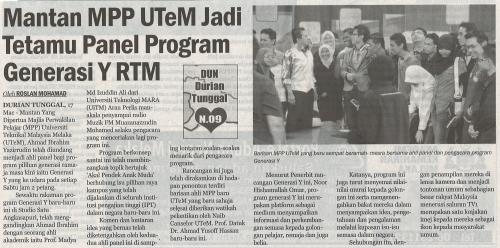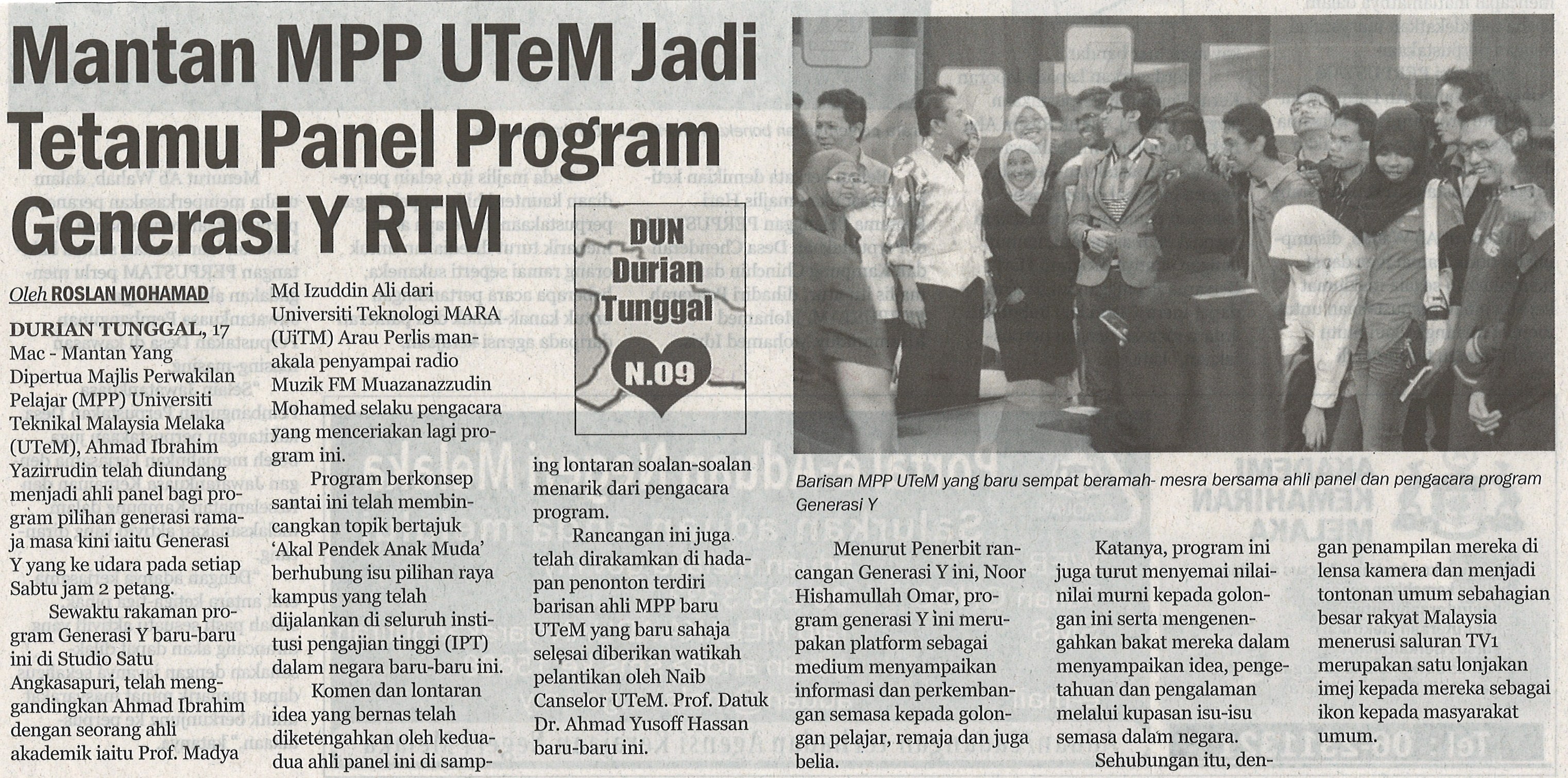 Mantan MPP UTeM Jadi Tetamu Program Generasi Y RTM