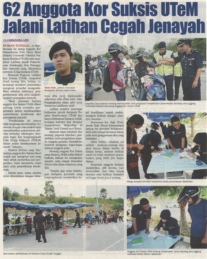 62 Anggota Kor Suksis UTeM Jalani Latihan Cegah Jenayah
