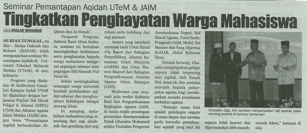 Semianr Pemantapan Aqidah UTeM & JAIM Tingkatan Penghayatan Warga Mahasiswa