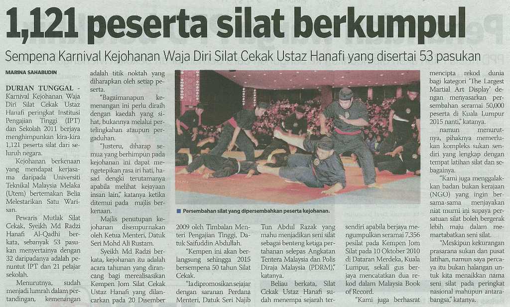 1,121 peserta silat berkumpul sempena Karnival Kejohanan Waja Diri Silat Cekak Ustaz Hanafi yang disertai 53 pasukan