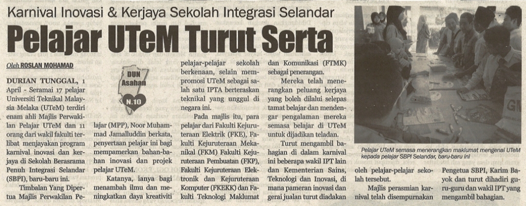 Karnival Inovasi & Kerjaya Sekolah Integrasi Selandar Pelajar UTeM Turut Serta